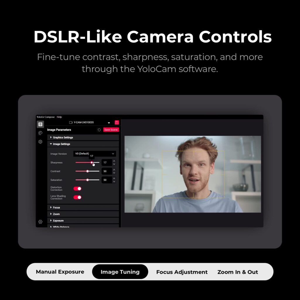 Fine-tune contrast, sharpness, saturation, and more through the YoloCam software.