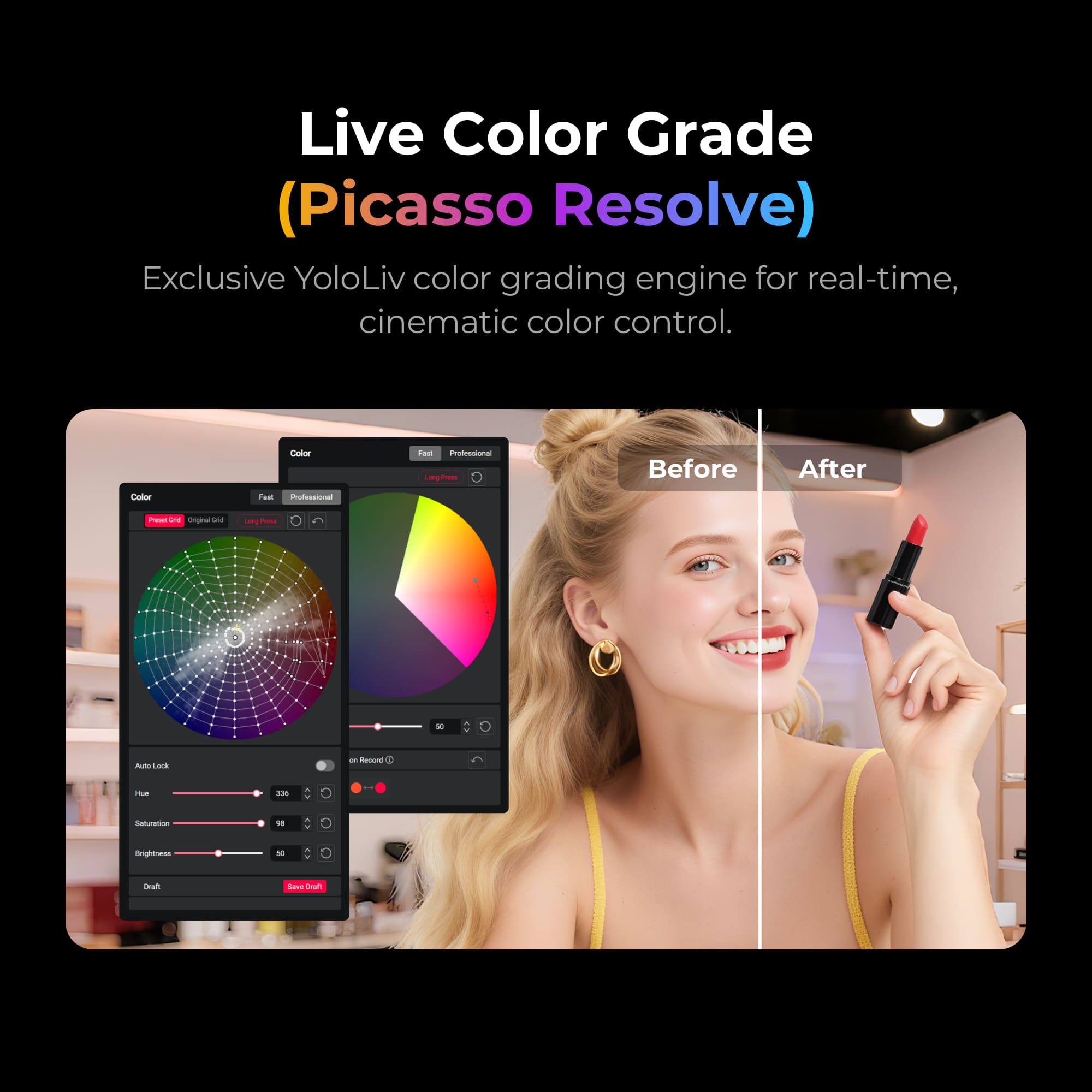 Exclusive YoloLiv color grading engine for real-time, cinematic color control.